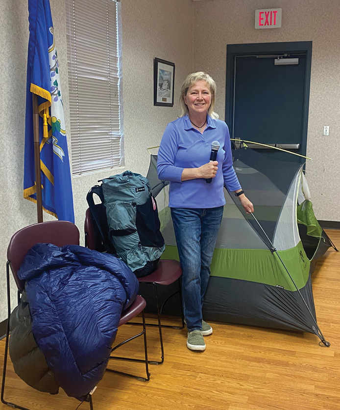 Jo Ann Smith was the May 1 guest speaker for the Granby Women’s Breakfast. Smith entertained more than 70 people with her talk about thru-hiking the Appalachian Trail. Smith came to the event with her tent, equipment and samples of dried meals as well as photographs of her adventure. Photo by Joan Ducharme