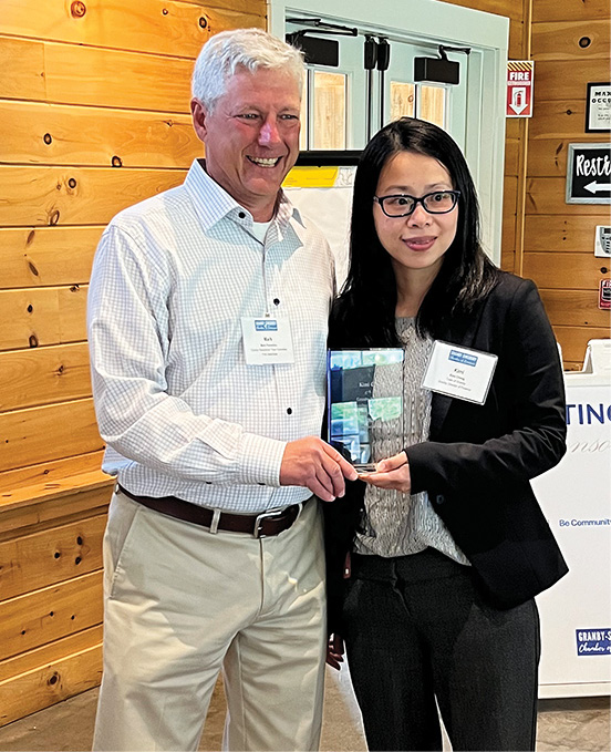 The Granby-Simsbury Chamber of Commerce awarded the Public Servant of the Year Award to Granby’s Director of Finance Kimi Cheng in recognition of her hard work, professionalism and technical expertise. Granby First Selectman Mark Fiorentino congratulates Cheng on the award. Submitted by Mike Walsh
