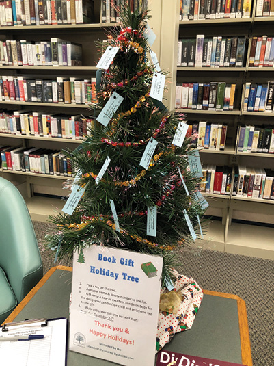 The holiday book gift-giving tree that benefits children in our community will be at the library starting on Dec. 5. The tree has tags with children’s ages for individuals to take and provide an age-appropriate gently-used or new book for the child. Drop the wrapped book back to the library by the date indicated on the display.