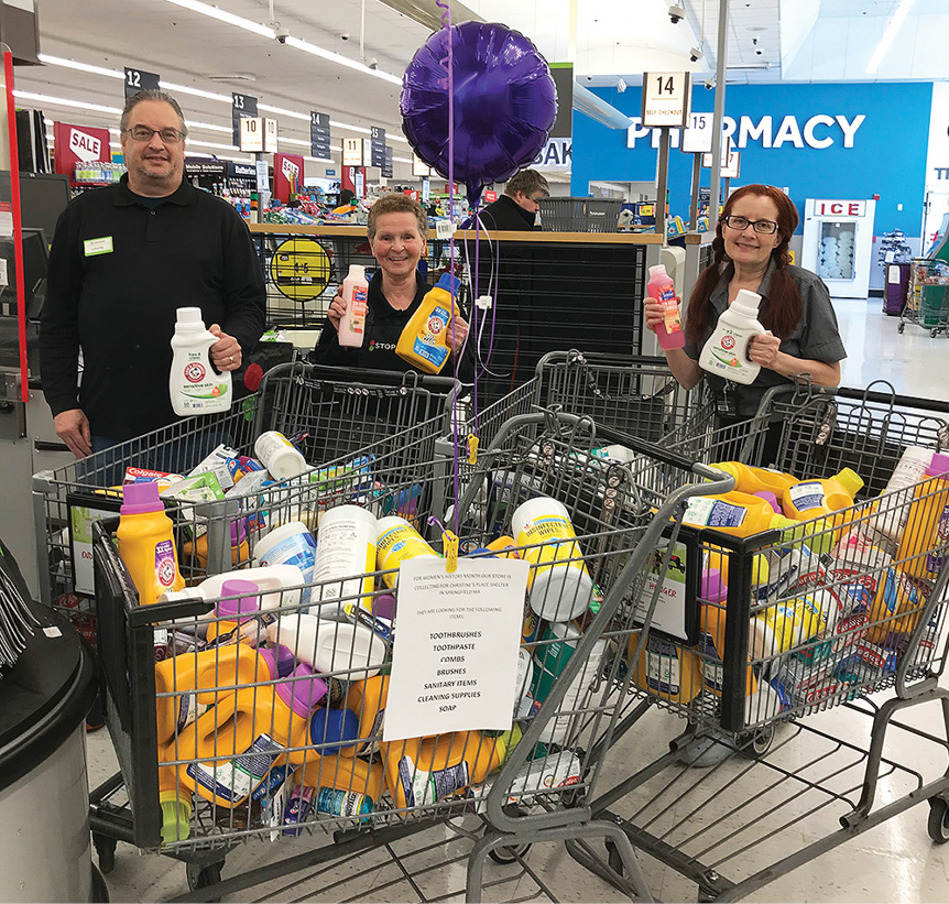 March was the month for honoring successful women. Rosia Kennedy, program coordinator at the Granby Stop & Shop, wanted to show support for brave women going through tough times at the Abused Women’s Shelter in Springfield. Through the generosity of Stop & Shop customers, the store filled five carriages of feminine-needs items and cleaning products and delivered them to the women’s shelter. From left, Chris McCann, Rosia Kennedy and Sheila White. Photo by Sheila White