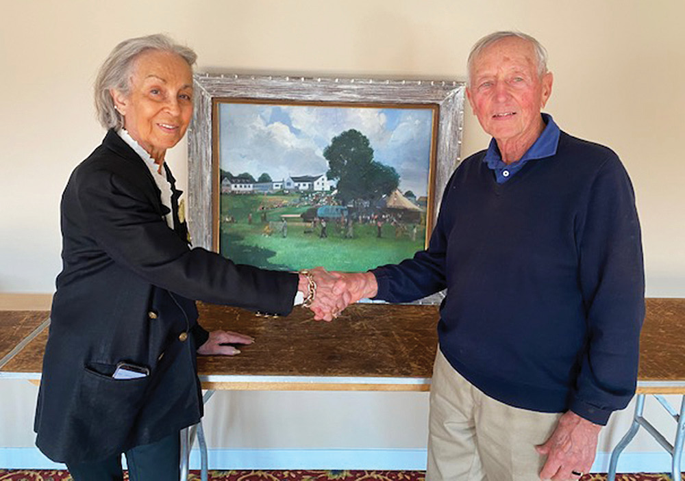 On April 23, Susan Regan (l.) of the Sylvia Davis Art Foundation presented an oil painting to Dick Zanini, director of history at the Wethersfield Country Club. The painting was completed by Sylvia Davis Patricelli in 1961 and reflects the practice tee at the 1961 ICO championship at the club.