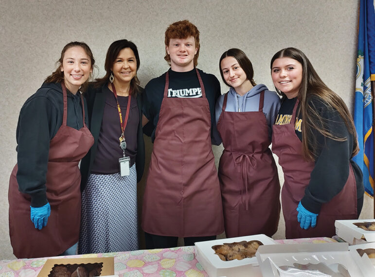 Granby’s School Superintendent Cheri Burke congratulated the GMHS culinary program bakers for a delicious breakfast. From left, Maeve Maroney, Burke, Hayes Horst, Claudia Ortiz and Callie Lawton.