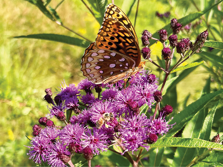 A great spangled fritillary butterfly sips nectar from a native ironweed plant (a valuable late-season nectar source for a variety of pollinators) on the Mary Edwards Mountain Property in North Granby. The Granby Land Trust manages this field, delaying mowing until after Oct. 1 to encourage wildlife and pollinator habitat. Photo by Rick Orluk