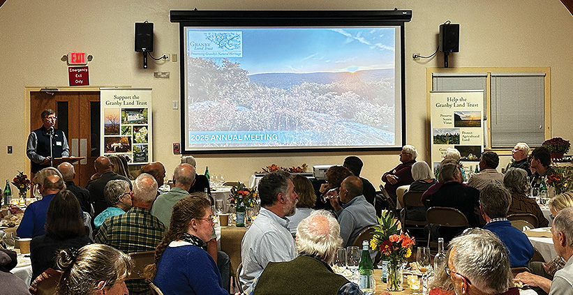 More than 110 Granby Land Trust members gathered for the 2025 GLT Annual Meeting and Potluck Supper on October 19 in Cook Hall at the Granby Congregational Church North Campus. Before the meeting, GLT Vice President Dave Emery led a hike through the Seth and Lucy Holcombe Preserve and onto the newly added Emery and Hart Family Preserves, to the Crag Mountain Lookout, where participants enjoyed spectacular views to the east and west.