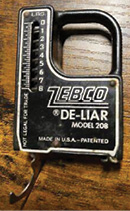 As you can see from the attached photo, the Model 208 De-Liar is a handheld scale that uses spring-tension technology to weigh fish. To use it, you hang your fish from a hook attached to a pin that passes through a visible spring. At the top of the pin is a marker that slides through a slot marked in quarter-pound increments, from zero to eight pounds. The heavier the fish, the further the marker slides down the slot.