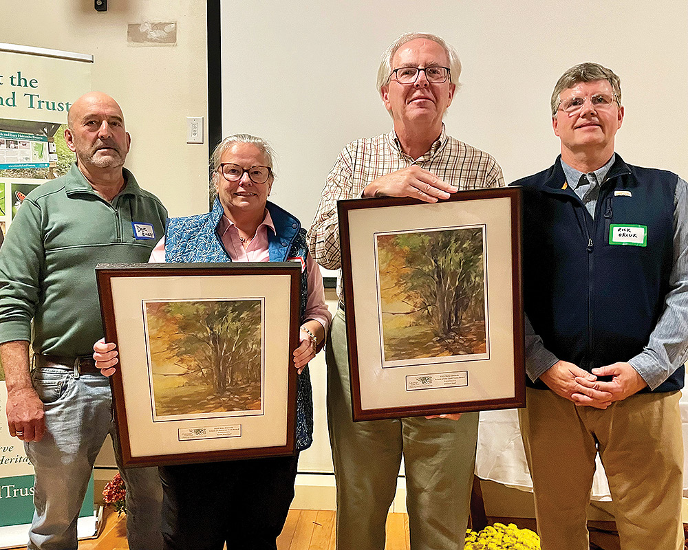 Sarah Koeniger and Will Hart (c.) received the 2025 Mary Edwards Friends of the Land Trust Award. GLT President Rick Orluk (r.) and GLT Vice President Dave Emery (l.) made the presentation. Photo by Don Shaw, Jr.