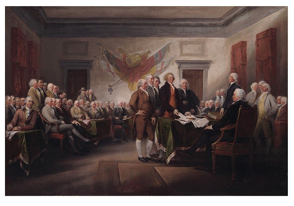 The Declaration of Independence, July 4, 1776, oil on canvas by John Trumbull (American, 1756-1843). Begun in 1786, the painting was completed in 1820, with Trumbull taking time to complete the likenesses, most from life, of the 48 people depicted. Image from Yale University Art Gallery, Trumbull Collection.