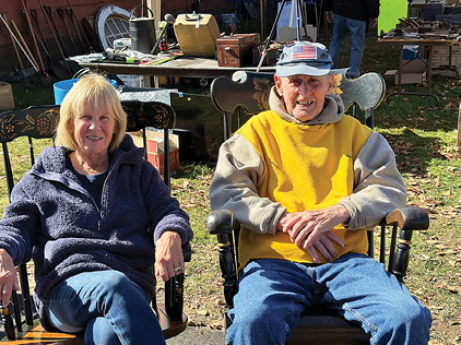 Martha Miller, curator of Salmon Brook Historical Society, and long-time volunteer Jim Glenney, get a brief respite at the society’s fall flea market on Oct. 18. Photo by Faith Tyldsley