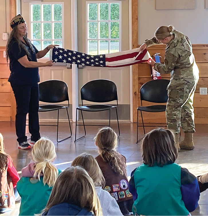 The women spoke about being in the military, including what it was like to be in a foreign country and the rigor of being in the military. The scouts also learned flag etiquette, such as how to properly display the American flag, how to carry it in a parade and how to properly fold the flag. The girls took turns applying their new knowledge by partnering into groups and taking turns folding and carrying an American flag.