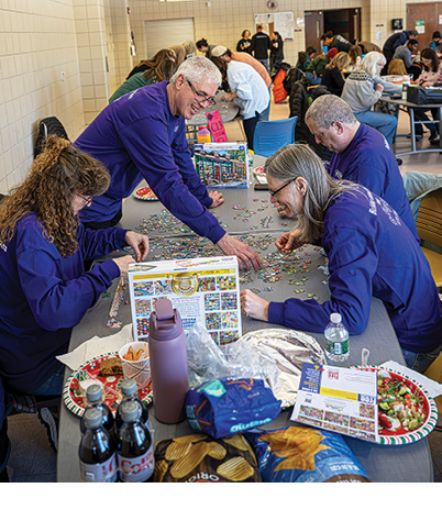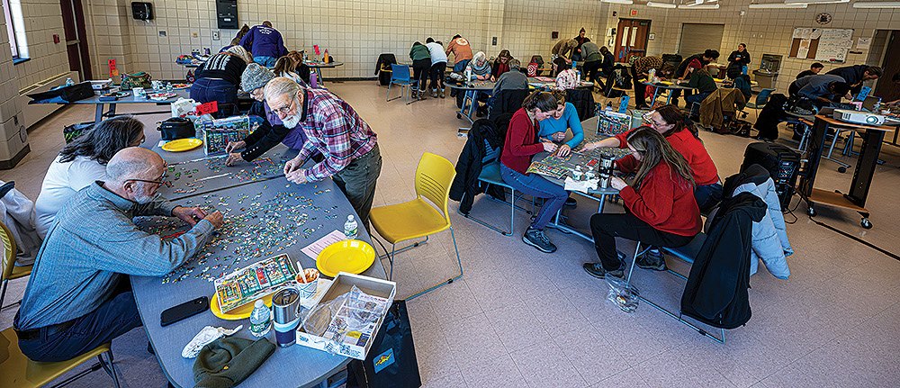 Each year, Terry Spak hosts friends and family at the Puzzle Slam. This year, she offered to move her group of 64 puzzlers to the cafeteria so that additional teams could compete in the gym. Spak, a midwestern native who has since settled in the center of Granby, invites dozens of friends, family, coworkers and other connections to join her in a team-of-teams in a very unique fusion of competition and reunion. “There is nothing we wouldn’t do for Terry,” a friend who had driven up from New Haven County said.