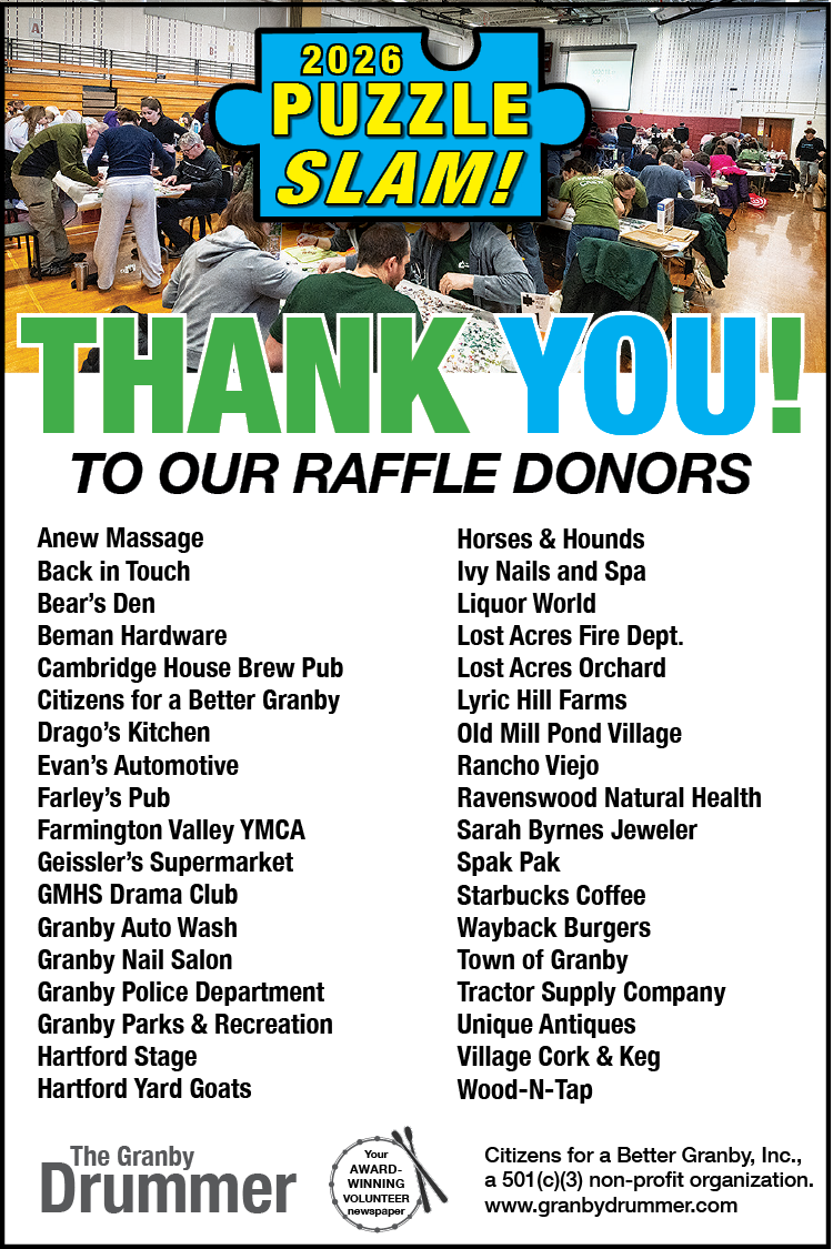 A key component to the Slam’s success is the tea-cup style raffle, which is spearheaded by Terry Spak. Other contributors who helped ensure the event’s success are Rick Orluk, the “voice” of the Slam, pictured below, and the high school’s Fine Arts Booster Club that sold concessions while promoting its March performance of The Little Mermaid. Long-time Granby Camera Club members Ed Judge and Jay Harder returned this year to photograph the Slam. This truly was a community effort. In addition, more than 30 local businesses contributed items for the raffle (see ad below). The Drummer remains strong thanks to the support it receives from the people it informs.