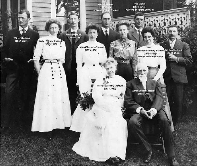William and Jessie Shattuck had five children. Of these, Alice (1901–2001) appears to be the most invested in her parents’ lives at the time the diary is written. She, along with her husband Walter and son Robert, drove from their home in New Britain to Granby as often as twice a week to help when Jessie was unwell.